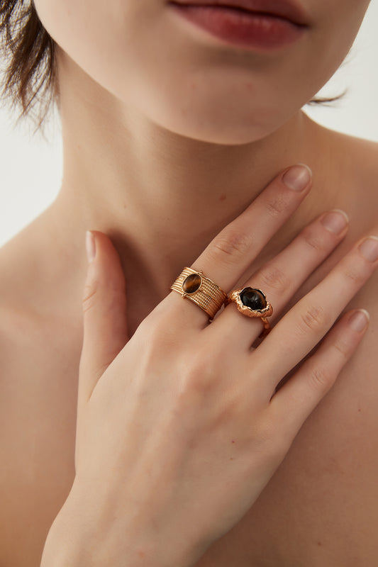 GEM GAZE BLACK AGATE AND SMOKY QUARTZ ADJUSTABLE RING